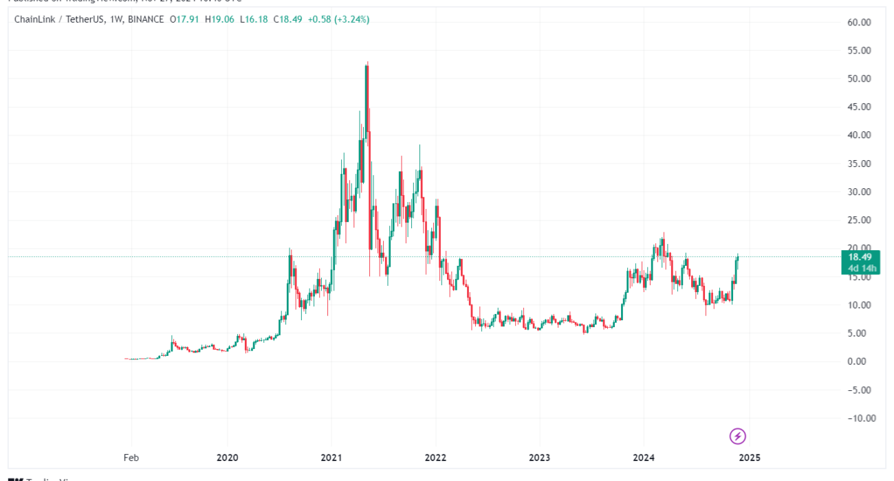 Launched in November 2017, Chainlink has seen an all-time high of $52.70 in 2021 and is currently trading around $18.49 (at the time of writing).
