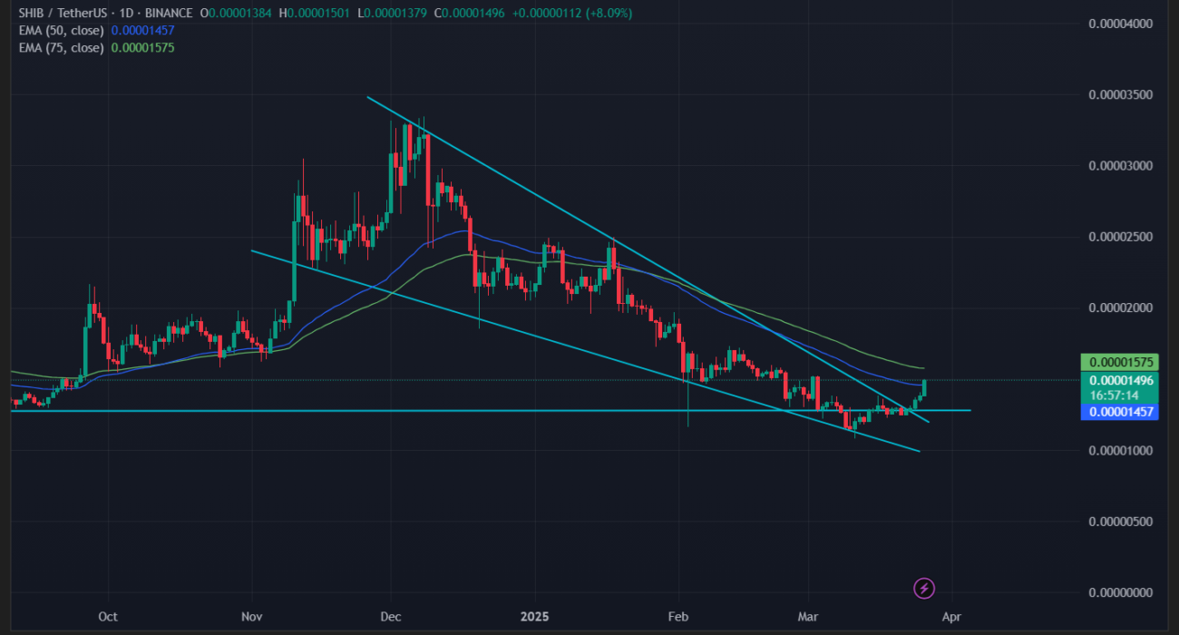The price bottomed out near $0.0000123, which is now acting as strong support. With SHIB climbing past those short-term moving averages, it looks ready to take aim at the 75-day EMA, which is around $0.00001575.