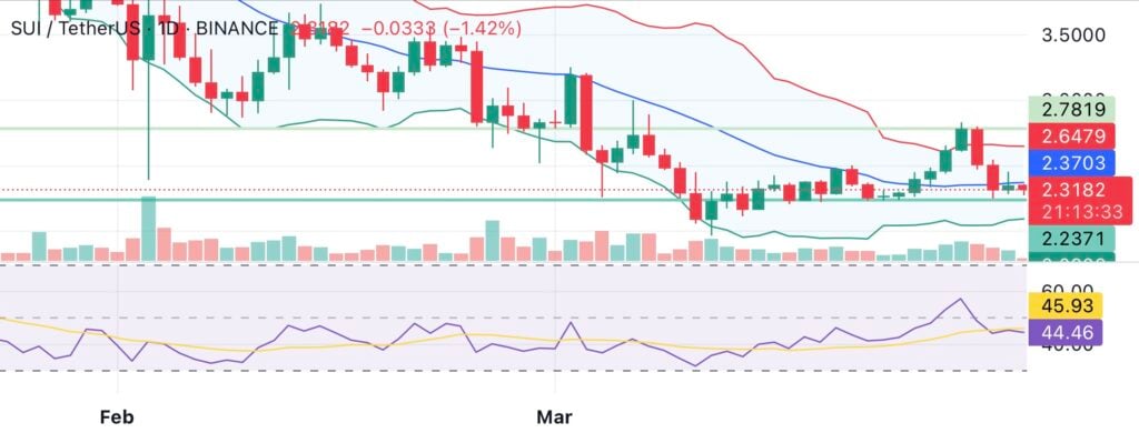 SUI is currently trading at $2.32, in line with the 20-day simple moving average, with resistance at $2.37. The next important resistance levels are $2.64 and $2.78 if the price rises above this level. The closest support level on the downside is $2.23. A decline to $2.00 might occur if selling pressure increases.