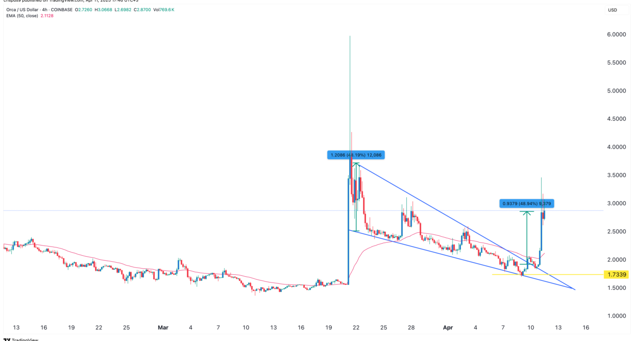 The four-hour chart shows that Orca bottomed at $1.733 on April 9 before rebounding to $2.90. This recovery followed a confluence between the upper and lower trendlines of a falling wedge pattern.
