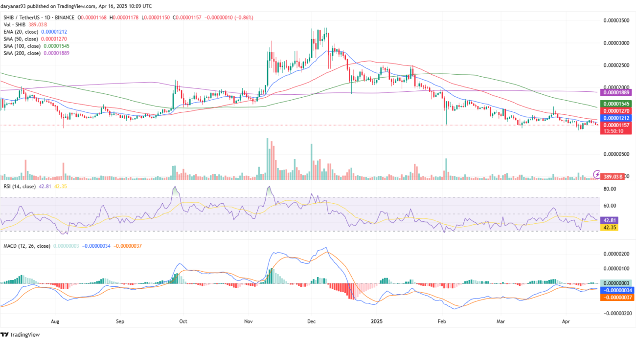 Even though the overall trend is still bearish, with SHIB price trading below all key moving averages, momentum indicators reflect a slight cooling of bearish pressure. The Relative Strength Index is hovering around 42.81, neither oversold nor strong, suggesting weak bearish momentum but also room for recovery. RSI has also been flat-lining, which often precedes a bounce—especially when paired with key support. The MACD histogram is flat, indicating that selling pressure may be losing steam.