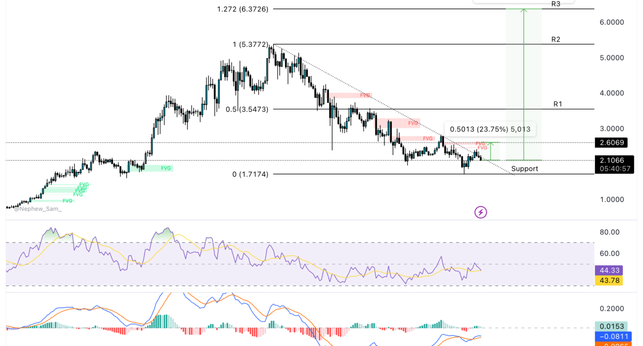 SUI has been in a downward trend since its January peak. SUI could gain 25% and test resistance at the upper boundary of a Fair Value Gap (FVG), at $2.6069. If SUI sees a daily candlestick close above this level and flips it into support, it faces resistance at R1, R2, and R3, the 50%, 100%, and 127.2% Fibonacci retracements of its decline from January top to April 2025 local bottom.