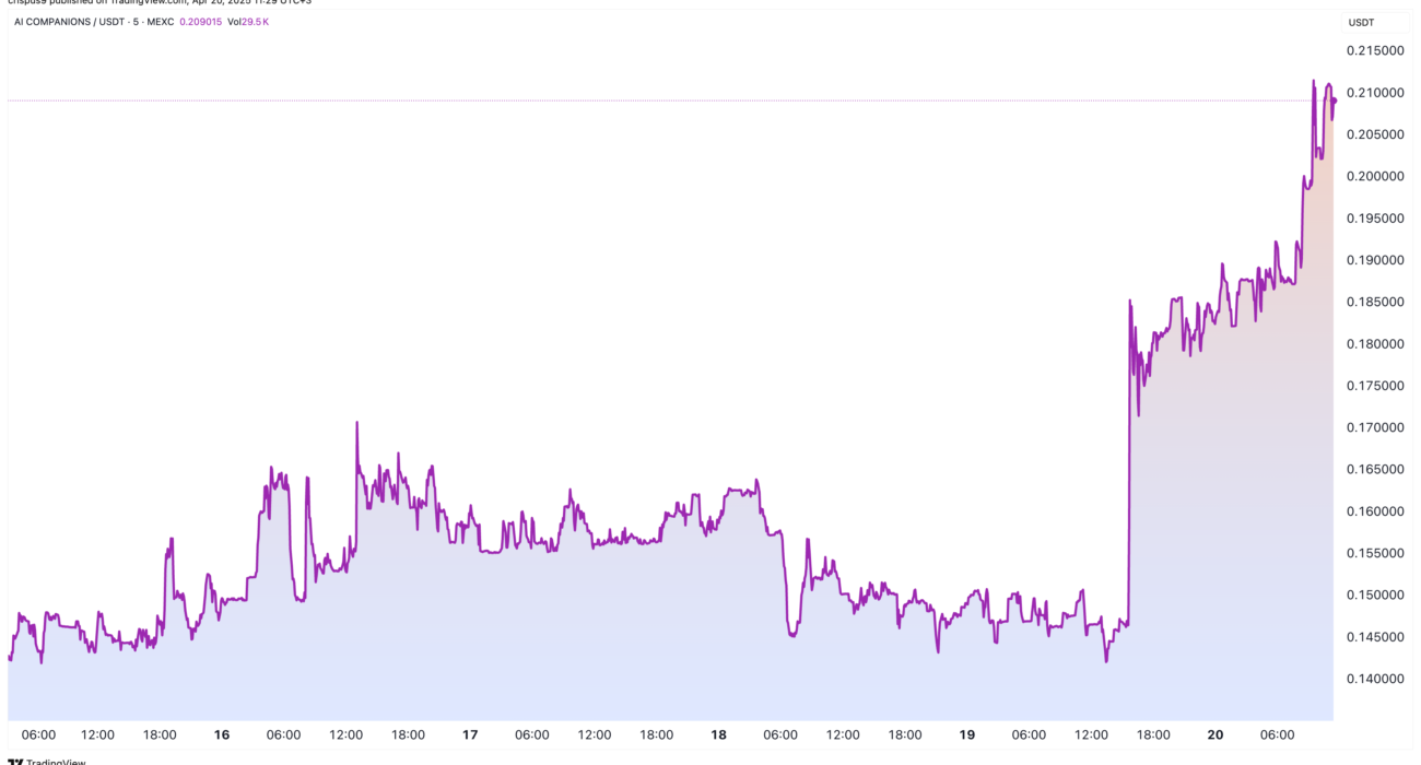 AI Companions (AIC) tokens jumped by over 40% to $0.2120, its highest point since March 30 and 70% above its lowest point this month.