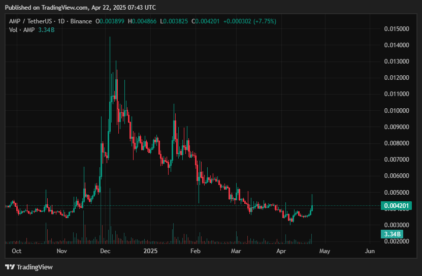 Since its launch, Amp (AMP) has seen an all-time high of $0.1208, followed by a 96.5% drop in price. At the time of writing, it is now trading at $0.004201, which is around a 71% decrease from its price of $0.014463, which was recorded four months ago in December 2024.