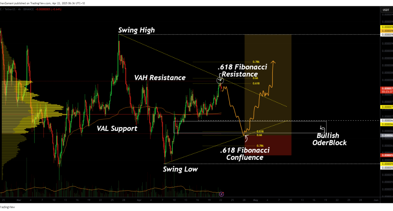 Pepe price action (PEPE) is currently facing a local resistance zone, one that is not necessarily bearish in nature but could act as a springboard for a bullish continuation. The region being tested aligns with the 0.618 Fibonacci retracement and the value area high from the local range, making it a strong candidate for a healthy rejection. Rather than expecting a sharp reversal, this scenario points to a potential retrace that would form a higher low — a classic bullish continuation signal if confirmed by follow-through.