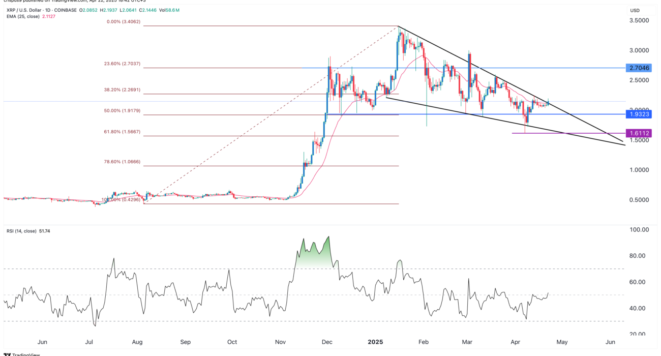 These two trendlines are now about to converge, which is typically where breakouts occur. DOGE has already moved above the wedge’s upper line, signaling a potential breakout. The bullish outlook is further supported by the formation of a double-bottom pattern at $0.1445. Additionally, the Relative Strength Index has crossed the neutral 50 level, indicating building momentum.