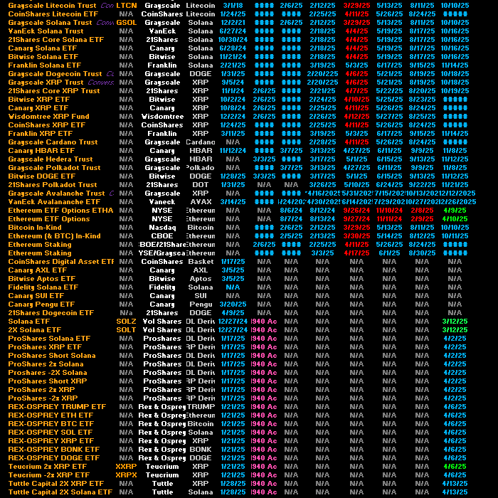 Bloomberg’s analyst James Seyffart has been tracking the growing list of ETF submissions currently awaiting regulatory approval. Among the pending applications are ETFs tied to Solana (SOL), Ripple (XRP), Sui (SUI), Litecoin (LTC), Axelar (AXL), Binance Coin (BNB), Cardano (ADA), Avalanche (AVAX), Dogecoin (DOGE), Aptos (APT), Chainlink (LINK), Bonk (BONK), and even newer memecoins like Pudgy Penguins (PENGU), Official Trump (TRUMP), Melania (MELANIA).