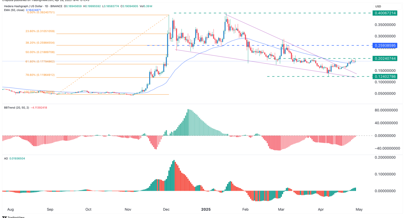 Hedera Hashgraph’s token may be on the verge of a strong bullish breakout after forming a giant falling wedge pattern.