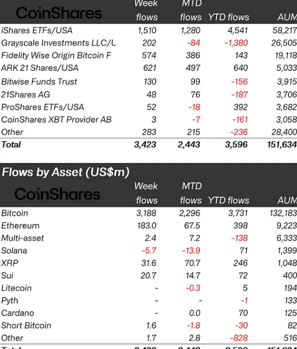 Last week, the digital asset market recorded its highest amount of inflows since mid-December 2024 and the third-largest weekly inflow of all-time. Digital asset investment products saw $3.4 billion in inflows coming in from all providers. BlackRock’s iShares ETFs contributed the largest share by product, with weekly inflows amounting to $1.5 billion.