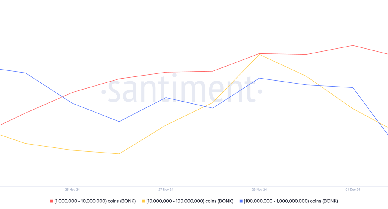 Bonk holders with between 1 million and 10 million coins have offloaded 500 million tokens since December. Similarly, wallets holding between 10 million and 100 million coins now hold 1.44 trillion tokens, while those with between 100 million and 1 trillion coins have also reduced their holdings to 1.44 trillion.