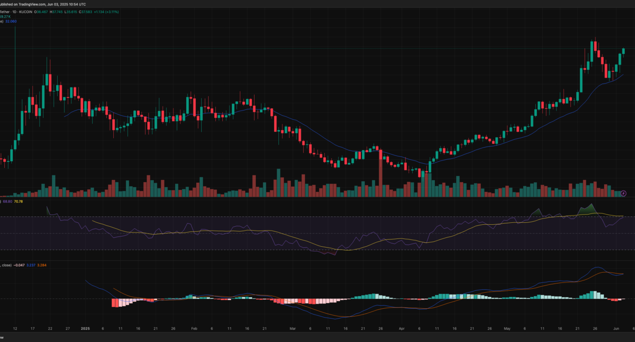 This surge extends HYPE’s rally from a recent pullback after setting an all-time high of $40 on May 26. The uptrend market structure remains intact, with HYPE price forming a consistent pattern of higher highs and higher lows, while staying well above the EMA 20 since the April trend reversal.