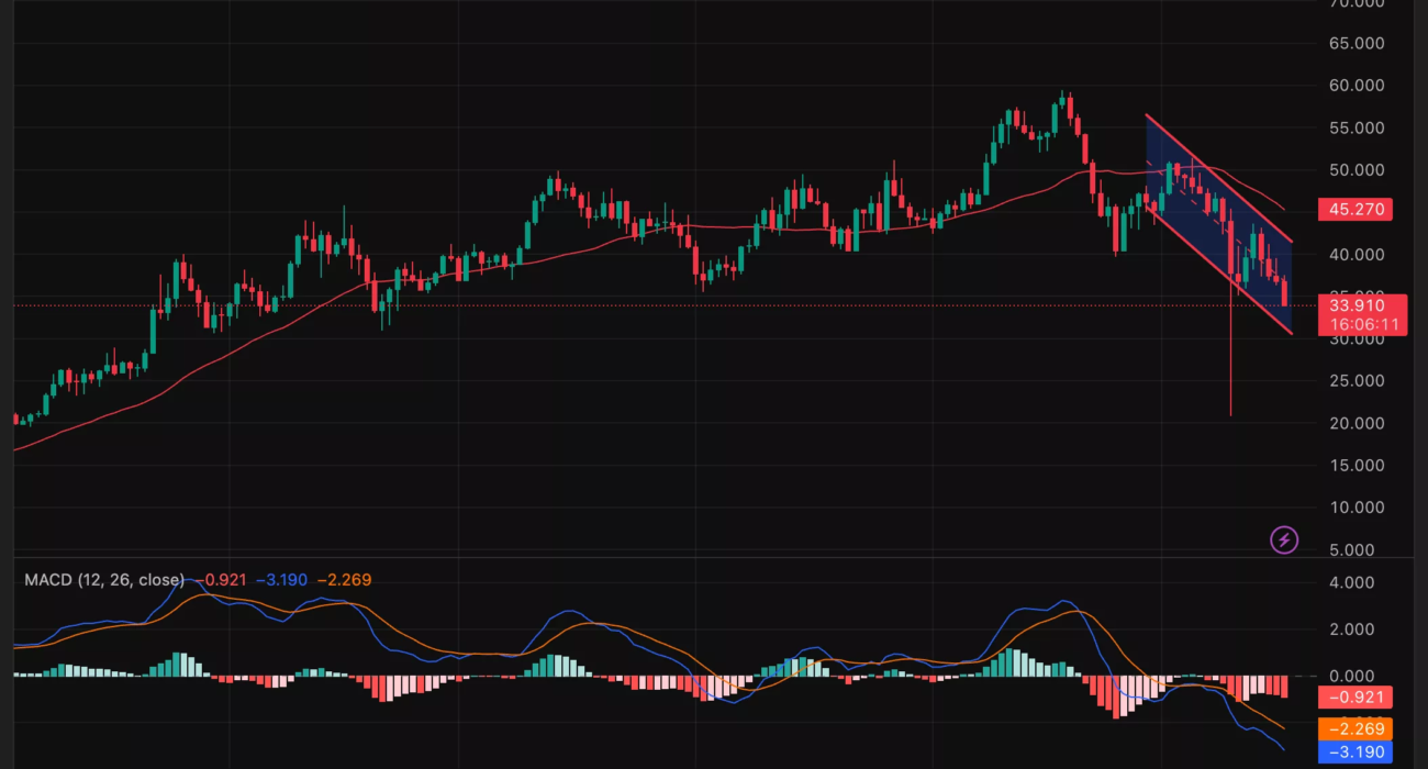 Meanwhile, the Moving Average Convergence Divergence (MACD) is showing a bearish crossover, with the MACD line at –3.19, well below the signal line at –2.27. This confirms that the market is currently dominated by sellers, and the negative histogram bars suggest that the selling momentum is continuing to increase.