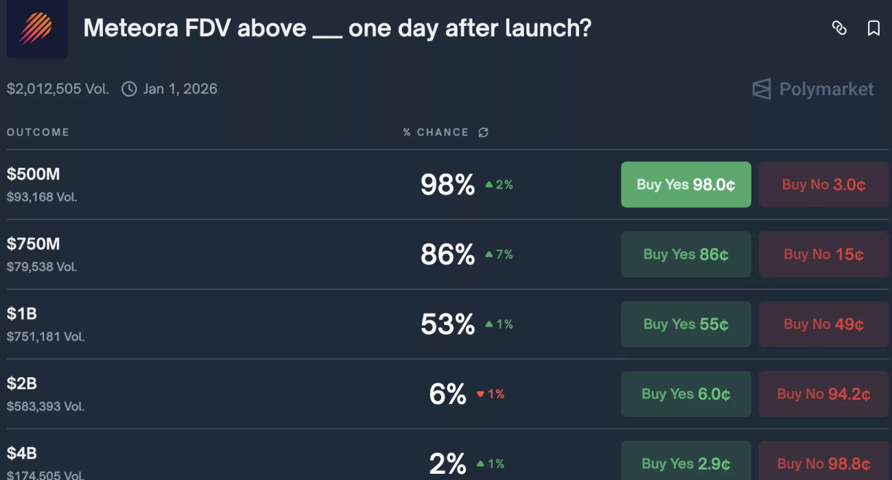 With such a high-profile project launching a token, speculation is intensifying over Meteora’s FDV after launch. Polymarket shows that traders are leaning toward a valuation between $750 million and $1 billion one day after launch.