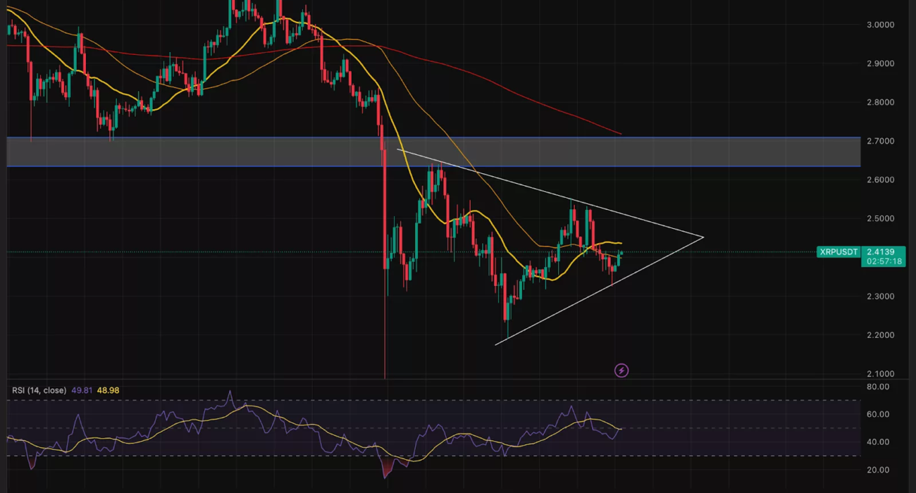 On recovering from the crash, XRP (XRP) began consolidating and is now forming a symmetrical triangle pattern on the charts. This consolidation shows the market uncertainty but also hints at a potential breakout that could set the next major trend for the token.