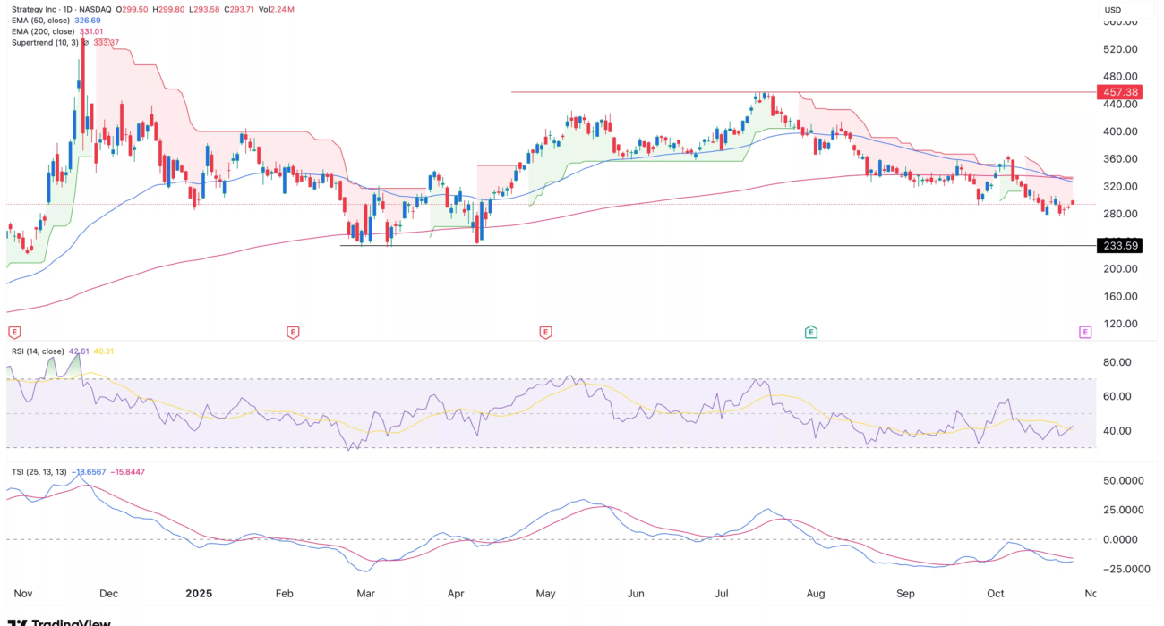The daily timeframe chart shows that the MSTR stock price has been under pressure in the past few months, moving from a high of $457 in July to $295 today.