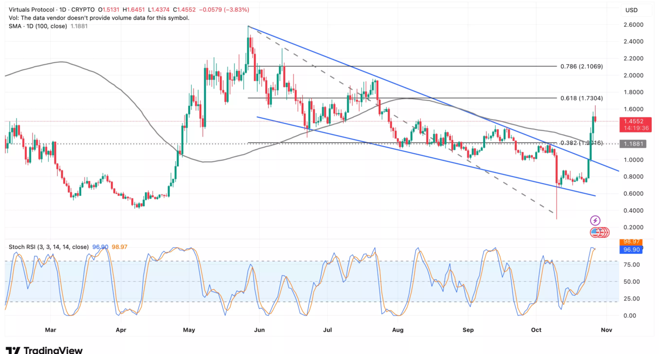 Virtuals Protocol (VIRTUAL) has recently staged an explosive breakout from a descending channel that had confined price action since late May. The breakout occurred near the psychological $1.00 level and propelled VIRTUAL price sharply higher, clearing major resistance at $1.18–$1.20 — marked by a confluence of a prior swing high, the 0.382 Fib, and the 100-day SMA.