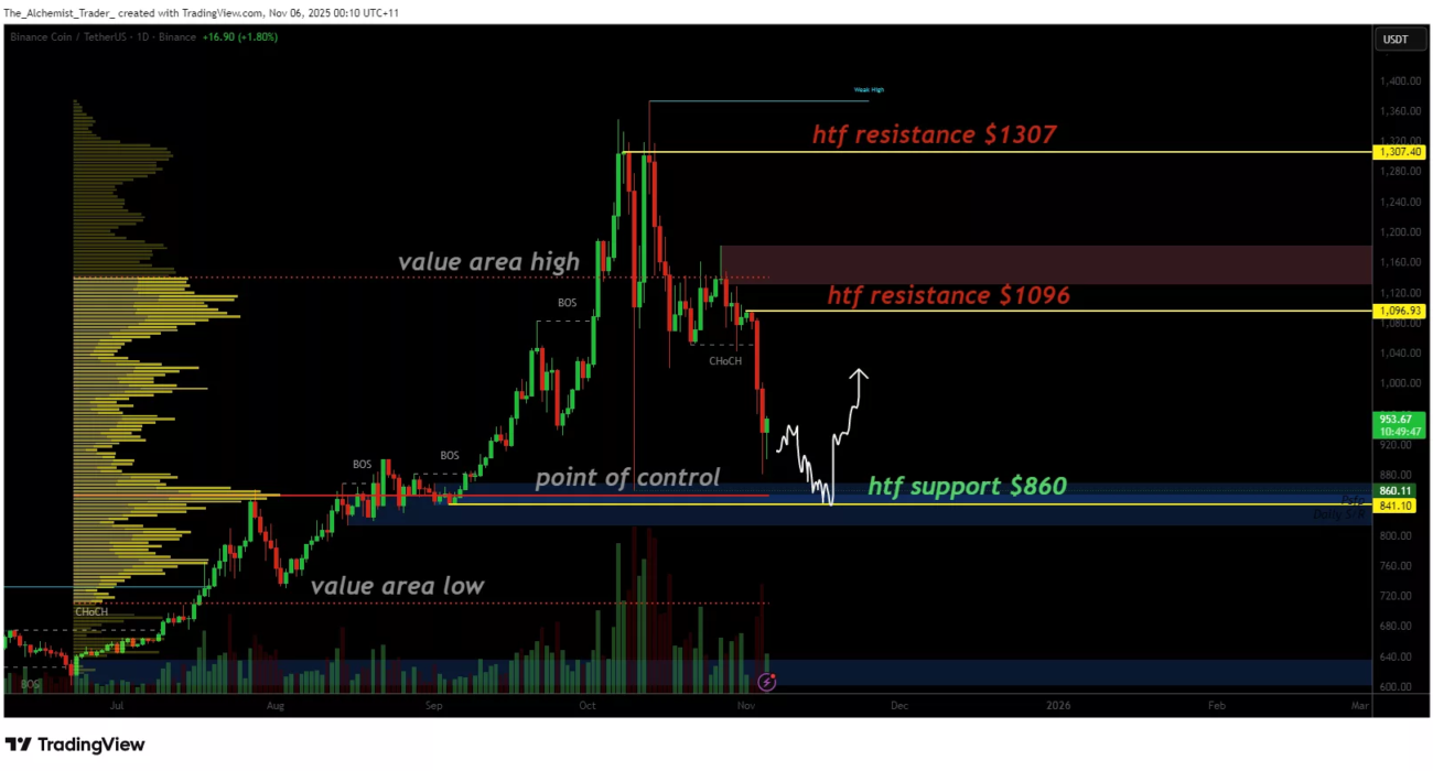 Binance (BNB) price has undergone a steep correction, dropping into the $880 region, where key technical support zones converge. This area marks the point of control (POC) and a high-timeframe support, creating a critical pivot that could determine whether a local bottom forms or deeper downside continues.