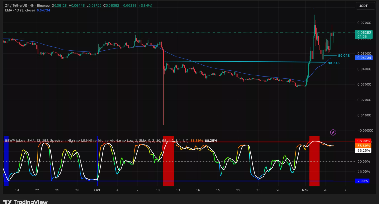 For now, this appears to be consolidation rather than reversal, as ZK price remains above the previous higher low of $0.045, keeping the HH-HL structure intact. It’s also holding above the 9 EMA, which means that buyers still control short-term momentum. Additionally, the BBWP volatility gauge has begun to contract after reaching extreme levels at the top of the rally — a sign that the market may be resetting volatility before its next move.
