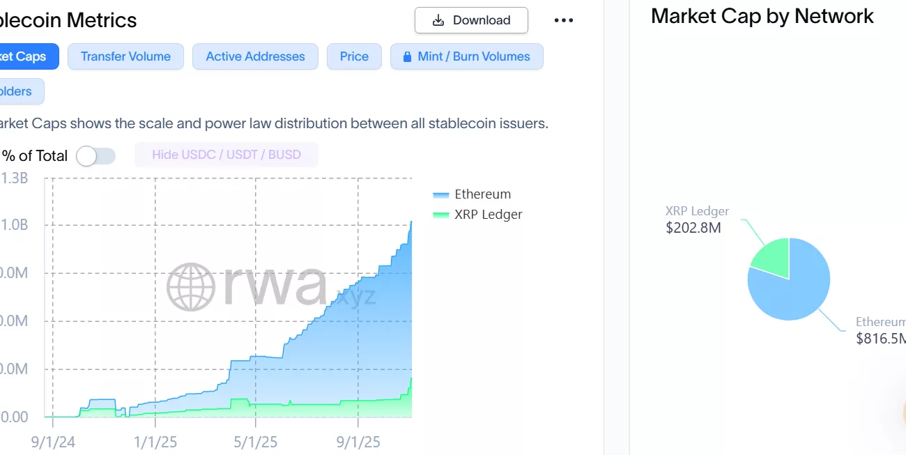The majority of its market cap share comes from its circulation on the Ethereum (ETH) network, which represents about 80% of the total supply or equal to $816.5 million, while the XRP (XRP) Ledger version accounts for roughly 20% or around $202.8 million on-chain.