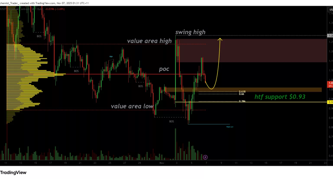 - Major Support: $0.93 region — includes a bullish order block and 0.618 Fibonacci level.