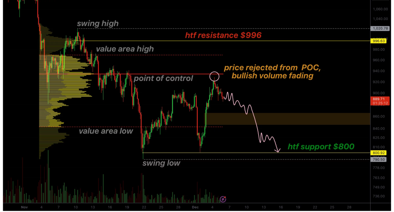 - The bounce from $800 lacks bullish volume, weakening the sustainability of the move.
