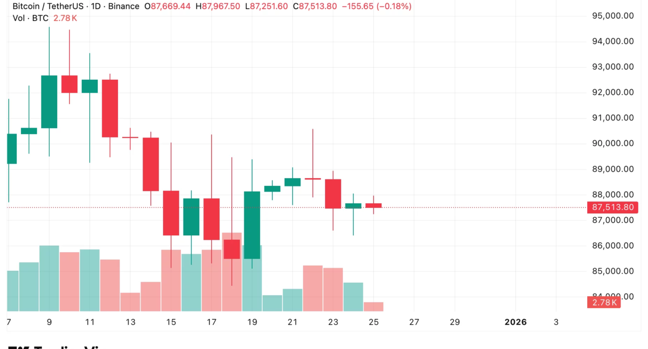 On Christmas, Bitcoin (BTC) is holding steady at around $87,500, gaining about 0.3% over the last 24 hours. The BTC price remains range-bound between $86,400 and $88,000, pointing to consolidation rather than panic selling.