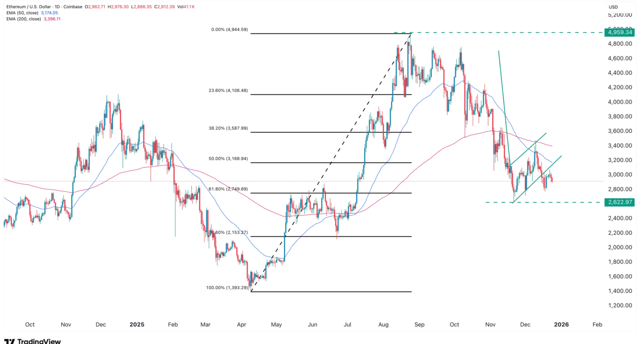 The daily chart indicates that the Ethereum price has declined over the past few months. It has moved from the year-to-date high of $4,960 to the current $2,915.