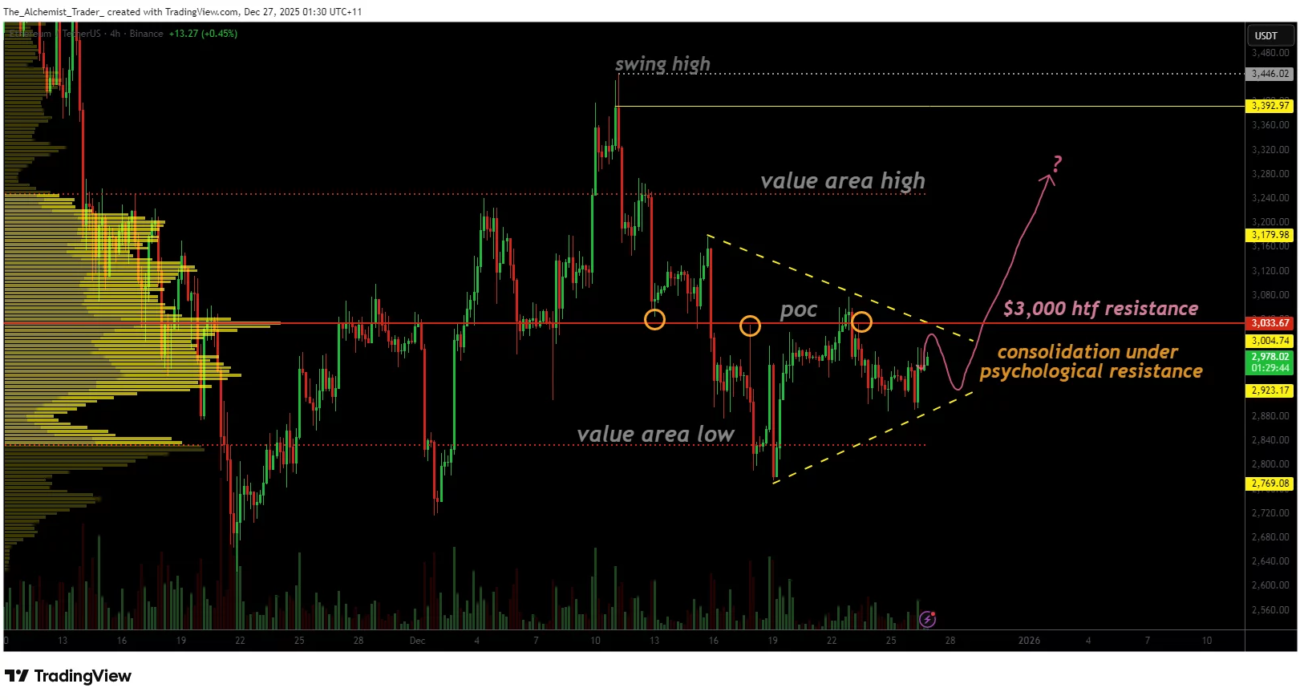 Ethereum’s current price action is notable not for what it has done, but for what it has not done. After multiple rejections from the $3,000 level, price has failed to roll over aggressively. Instead, ETH has entered a tight consolidation range directly beneath the resistance level, a pattern often associated with accumulation rather than distribution.