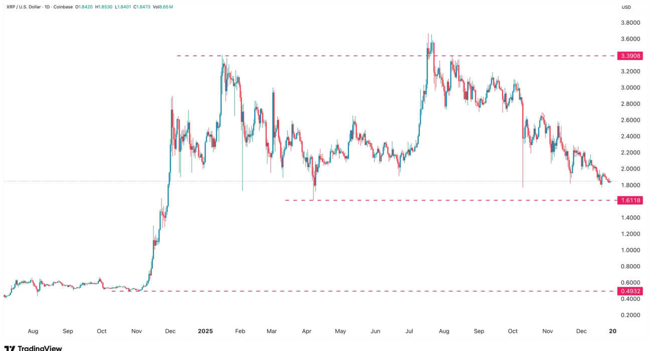 • XRP price dropped by nearly 25% in 2025 and by ~50% from the year-to-date high.