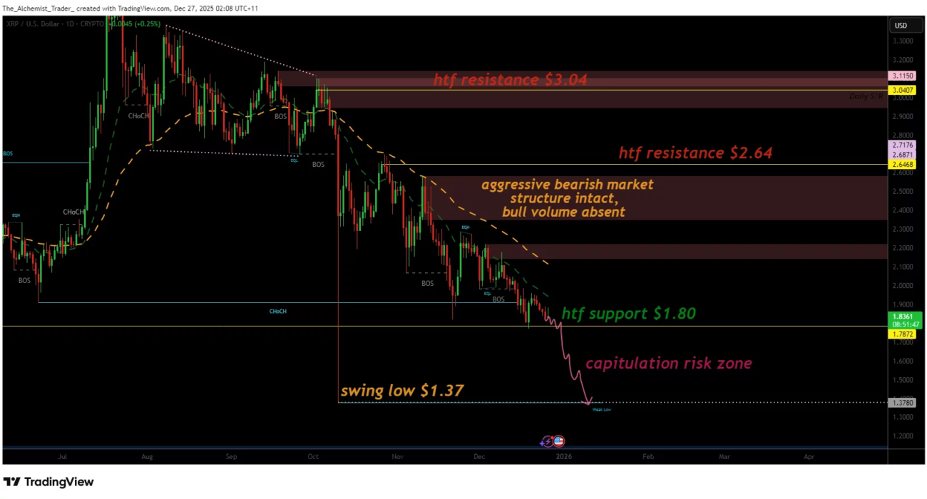 As long as XRP trades near $1.80 without meaningful volume support, the risk of a breakdown remains high. A decisive loss of this level could trigger a capitulation-style move toward $1.37. Any bullish scenario would require a precise hold above $1.80, followed by a break in bearish market structure and rising volume, signals that have yet to emerge.
