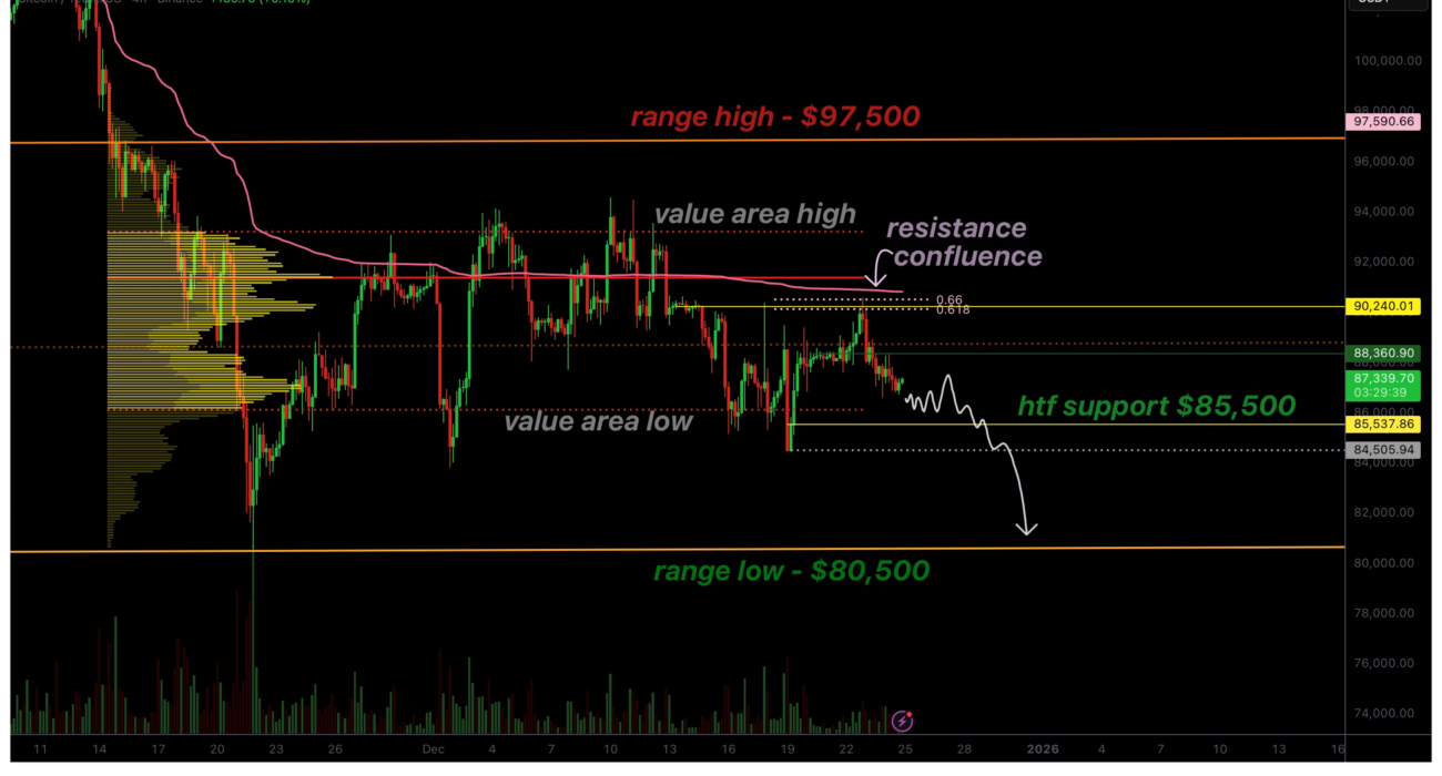 Conversely, a bearish resolution would involve a clean break below $85,500, followed by acceptance at lower prices. Such a move would likely accelerate toward the lower boundary of the range as liquidity is taken out below interim supports.