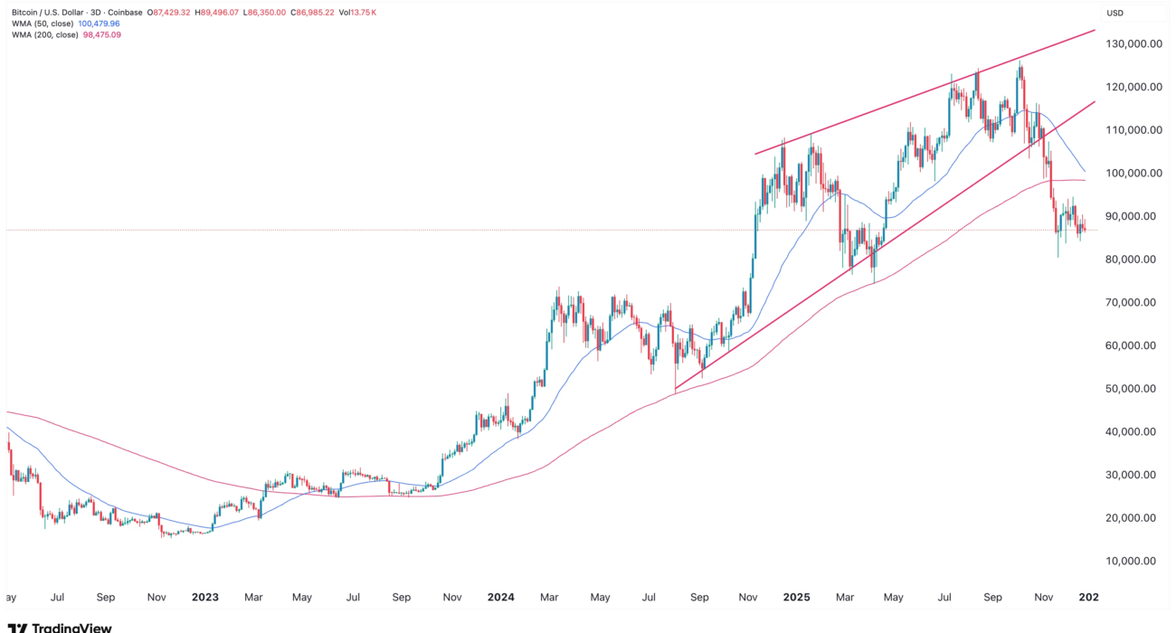 The three-day chart shows that Bitcoin price remains under pressure and has formed numerous bearish patterns that may lead to more downside in the near term.