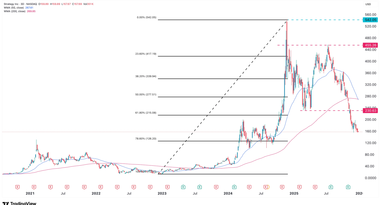 - Strategy’s stock price will likely continue to fall as sellers target the psychological threshold of $100.