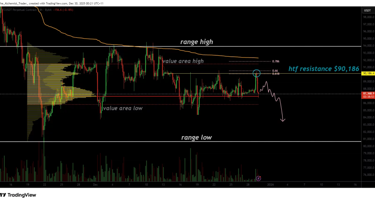 From a market-structure standpoint, Bitcoin remains range-bound, but the balance is beginning to tilt toward the downside. The sequence of lower highs beneath $90,000 reflects persistent selling pressure, while buyers have been unable to reclaim lost ground. This asymmetry often precedes range breakdowns rather than breakouts.