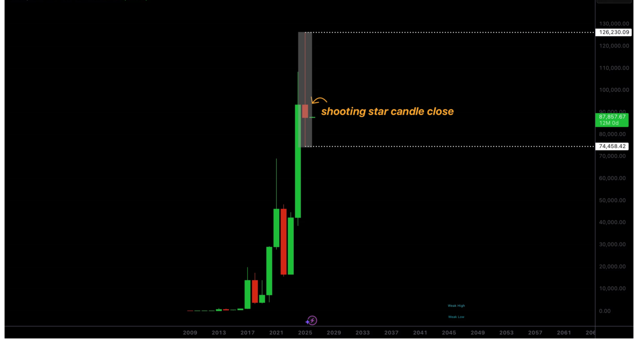While a single yearly candle does not confirm a full trend reversal, its placement at the top of a multi-year advance makes it a meaningful signal that warrants closer examination.