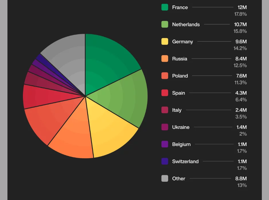 After that, the numbers start to thin out. Hungary, Ireland, Austria, Belarus, Slovakia, and the Czech Republic all show up with steady but smaller volumes, each adding a modest share to Europe’s overall traffic.