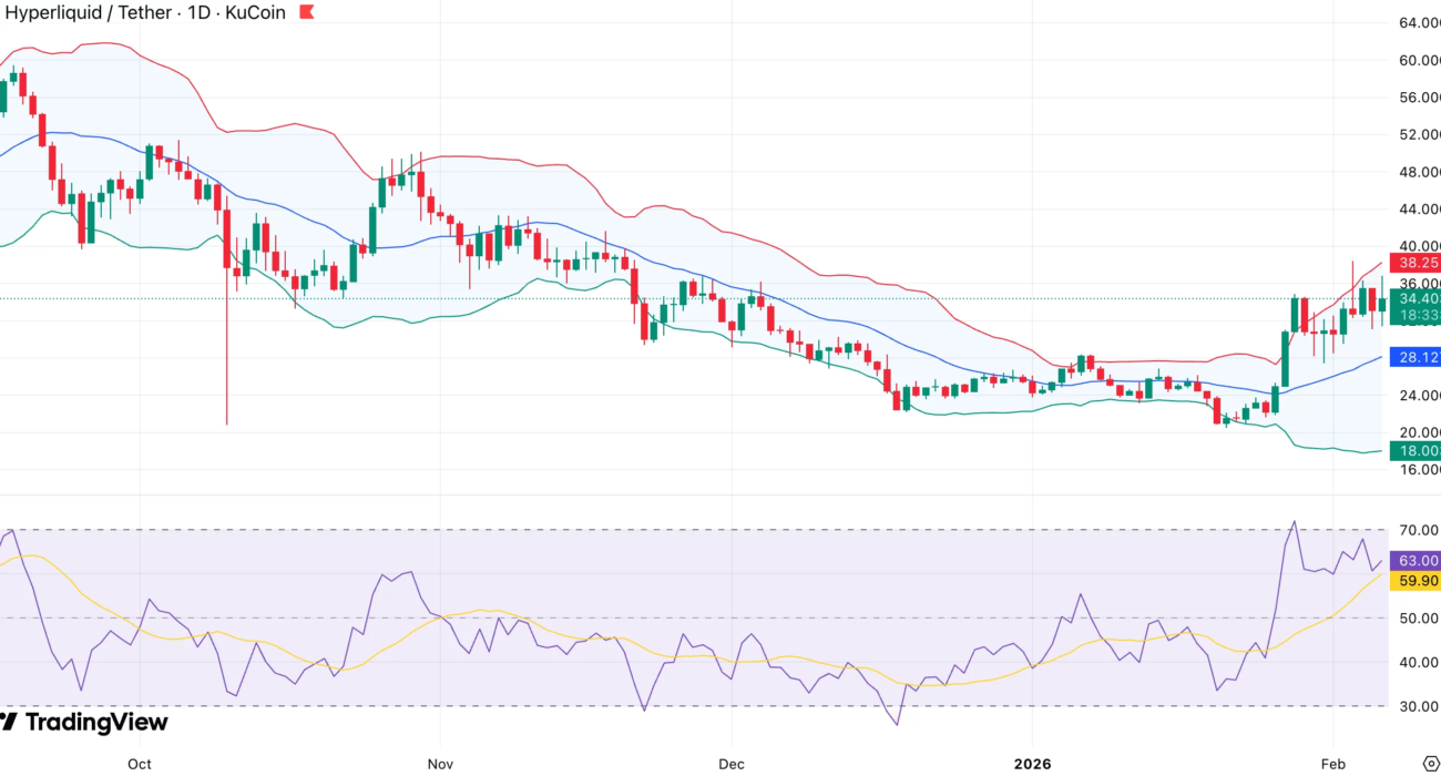 Despite a decline in the overall cryptocurrency market, Hyperliquid is up 2.9% on the day, trading at $34.80 at the time of writing. Most top-100 tokens posted losses, yet HYPE continued to attract buyers, maintaining a strong multi-week run.