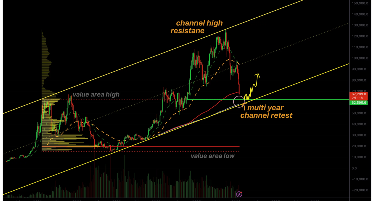 From a higher-timeframe perspective, Bitcoin’s current location is technically significant. The multi-year channel, which has guided price action since early 2021, has consistently acted as both support and resistance during major market cycles. Each historical retest of the channel’s lower boundary has resulted in strong reactions, often marking the transition from bearish phases into broader recovery structures.