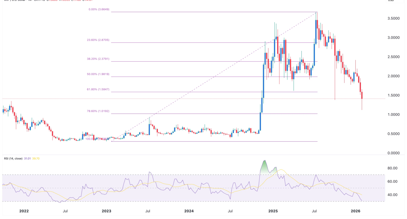 The weekly chart shows that the XRP token price has retreated sharply in the past few months. It retreated in the last five consecutive weeks and is now nearing its lowest level since November 2024.