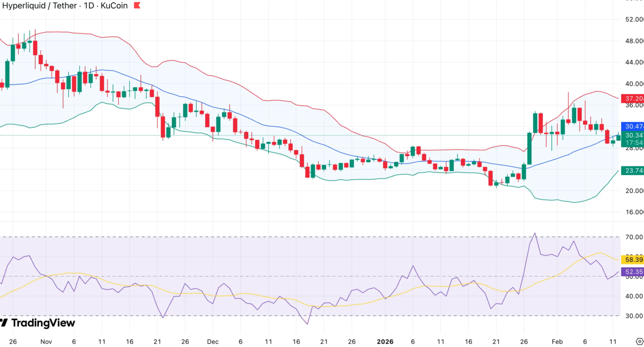 An attempted breakdown below $28 resembled a bear trap. Price briefly slipped under the 50-day moving average but quickly reclaimed it. HYPE now trades near the 50DMA at roughly $30.40.