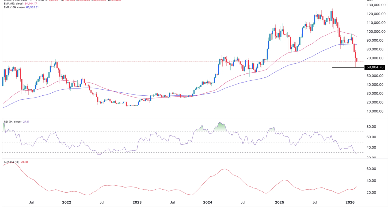 The weekly chart shows that the BTC price has declined over the past few months and is now hovering near its lowest point of the year. It has already dropped below the 50-week and 100-week Exponential Moving Averages. Also, the Average Directional Index has jumped to 30, a sign that the downtrend is strengthening.