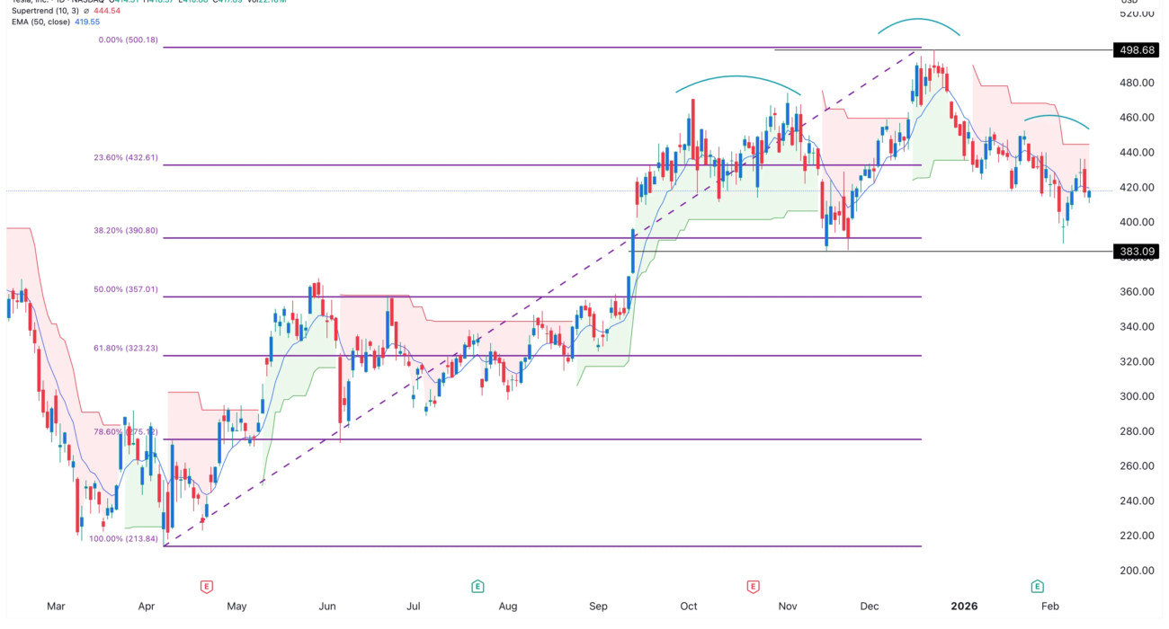 The daily timeframe chart shows that TSLA’s stock price peaked at $500 in December and has since retreated to $417. It has flipped the Supertrend indicator from green to red and moved below the 50-day Exponential Moving Average.