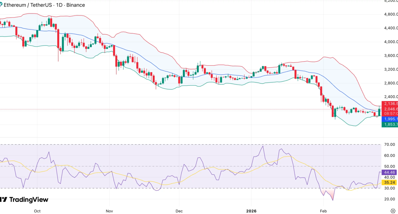 At press time, ETH was trading near $2,050, up about 3% over the past 24 hours. The move extends a week-long rebound of roughly 9%. Even so, the token is still down 30% over the past month and sits nearly 58% below its August 2025 peak of $4,946.