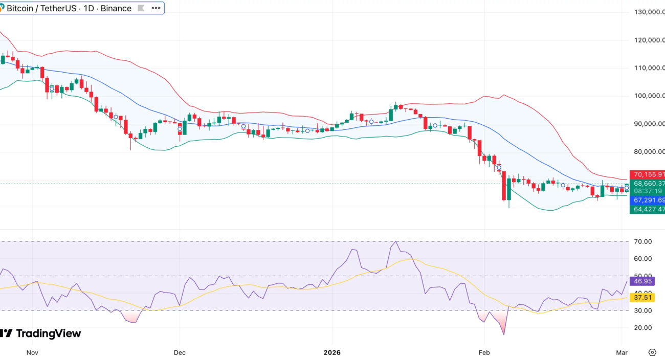 Bollinger Bands show that before rising, Bitcoin touched the lower band around $64,400. At $67,300, it currently trades near the middle band. The upper band, near $70,100, marks immediate resistance.