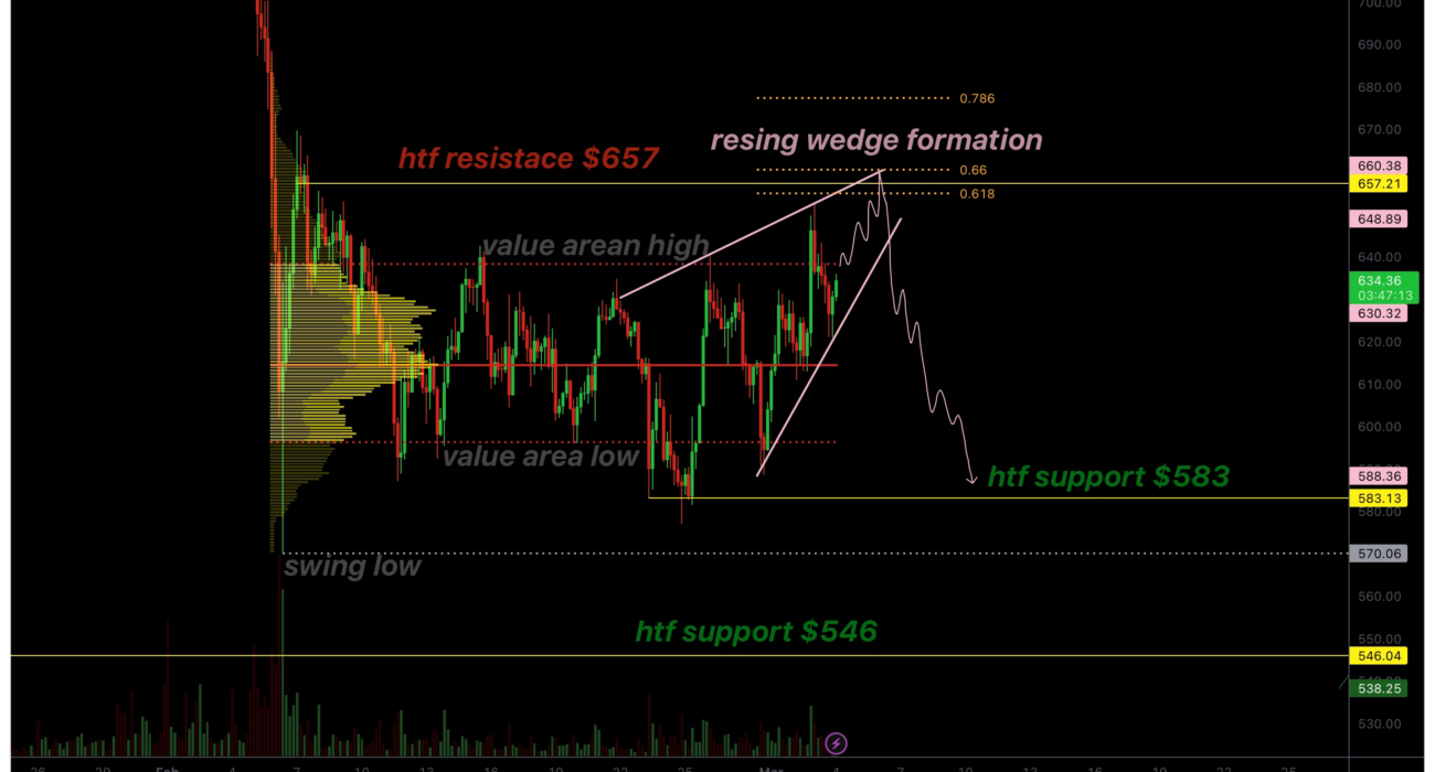 At present, price is trading near the Value Area High, approaching a major resistance cluster near $657. This level aligns with the 0.618 Fibonacci retracement and overlaps with the upper boundary of the rising wedge. The convergence of these resistance factors creates a technically significant supply zone where sellers may reassert control.