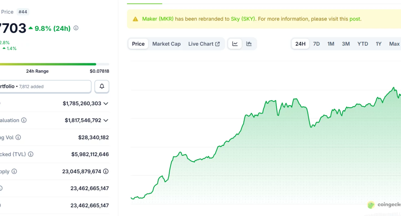 • SKY gained roughly 10% in the past 24 hours, according to on-chain and market data.