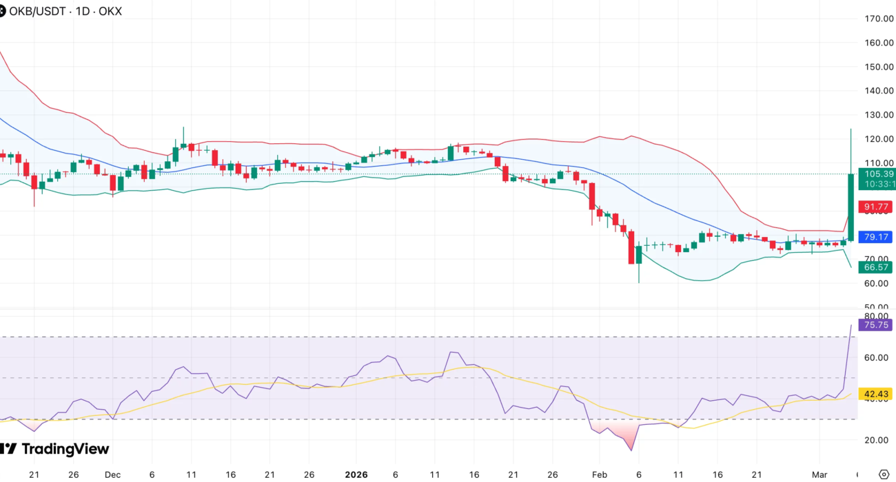 OKB (OKB) surged from about $77.29 to an intraday high of $117.60 following the announcement. At the time of writing, the token was trading at $107.79, still up roughly 40% over the past 24 hours.