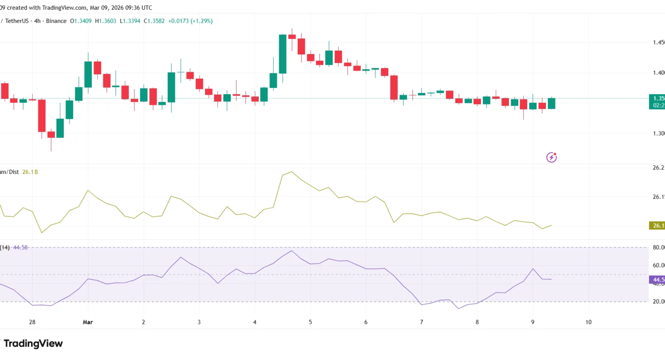 Additionally, the Accumulation/Distribution line remains relatively flat at 26.1 billion, showing that despite the price drop from $1.47, there hasn’t been a massive exodus of volume, pointing toward “strong hands” holding through the volatility.
