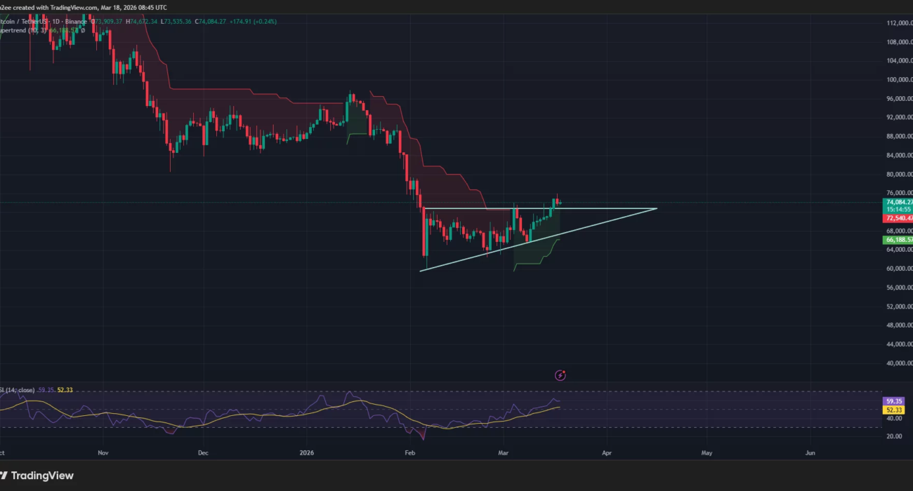 Bitcoin price has also moved above the Supertrend line, which has flipped green, a sign that the short-term momentum is turning positive.