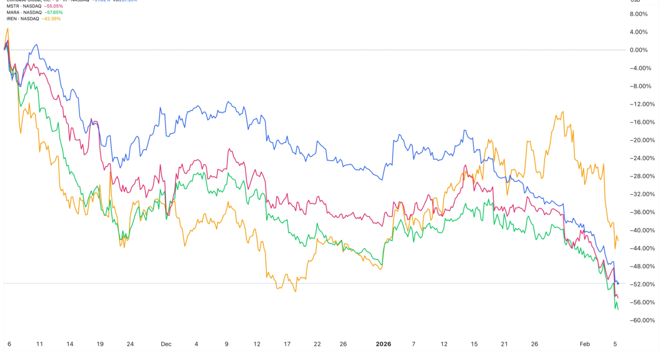 Crypto stocks MSTR, COIN, IREN, and MARA slump as liquidations jump